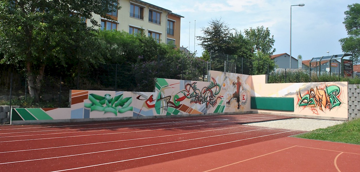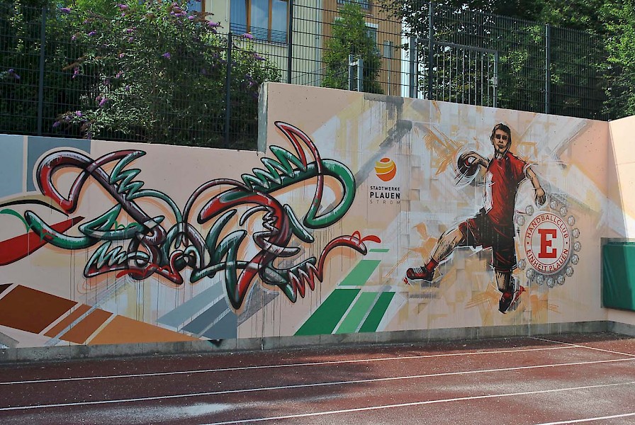 Handball in der Einheit Arena: dynamisch und energiegeladen. Die Außenanlage präsentiert sich von der sportlichen Seite, während der Innenbereich mit regionaler Note punktet.