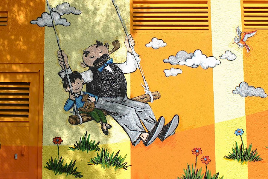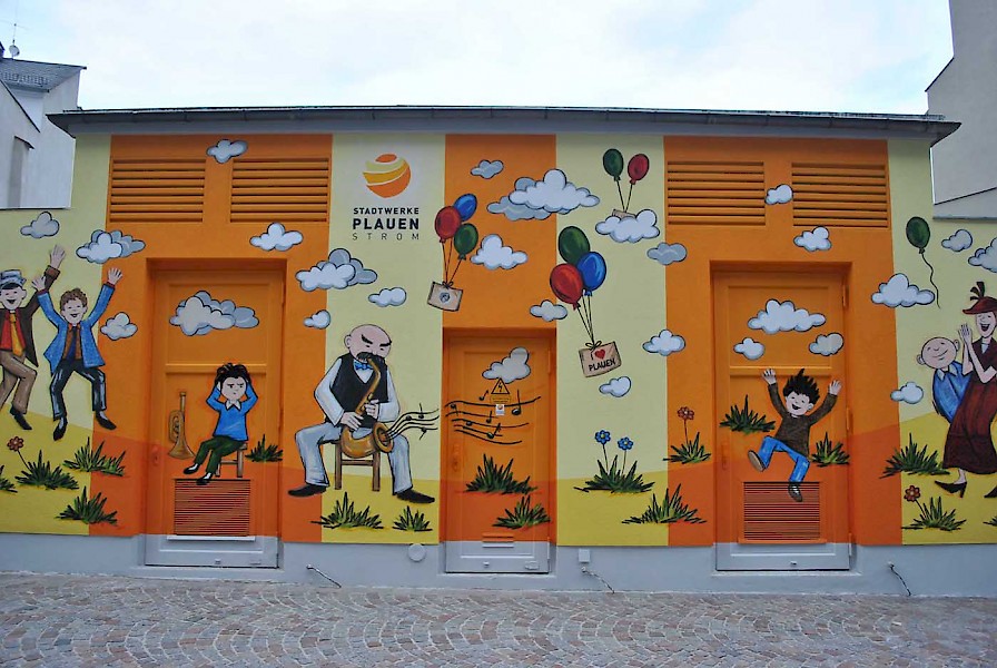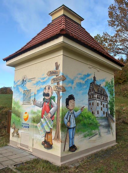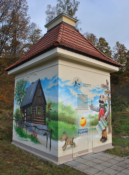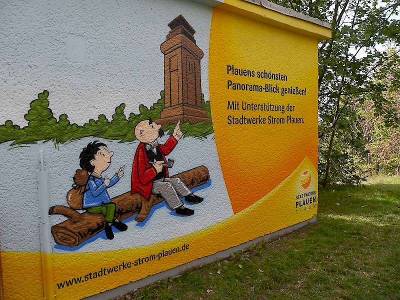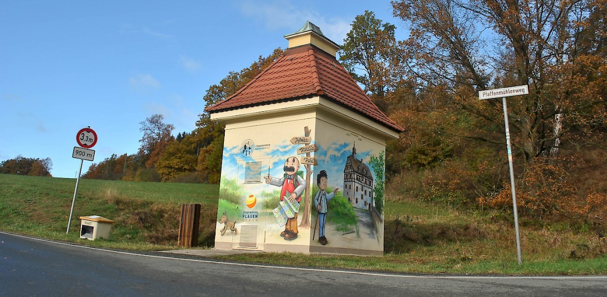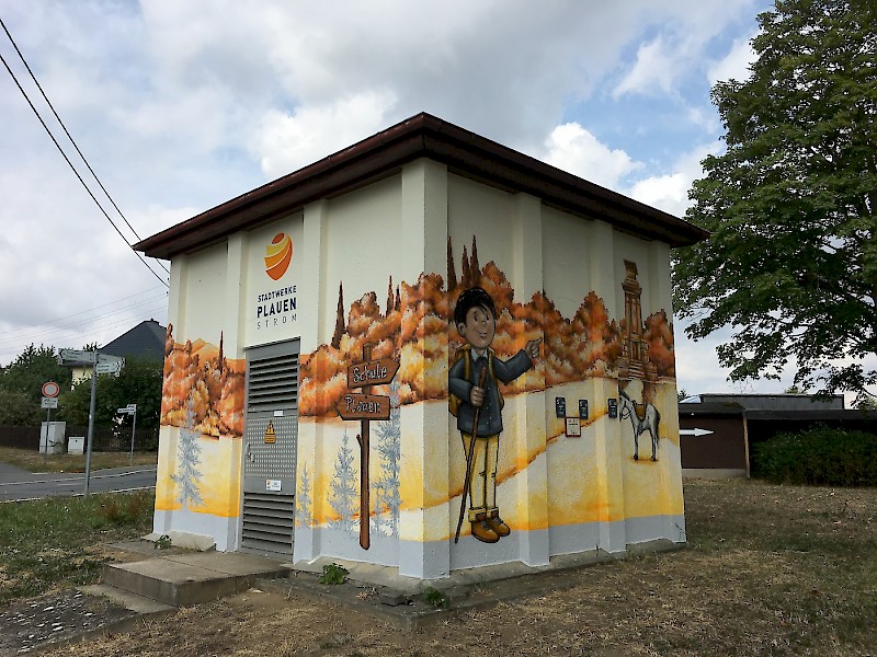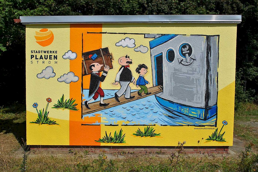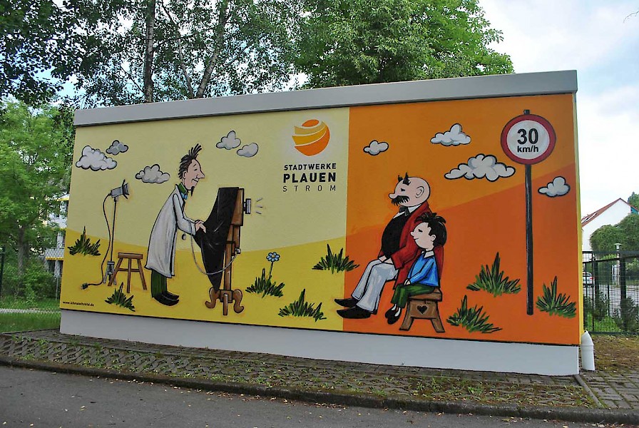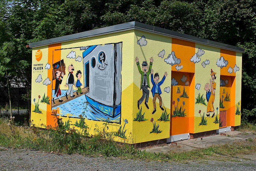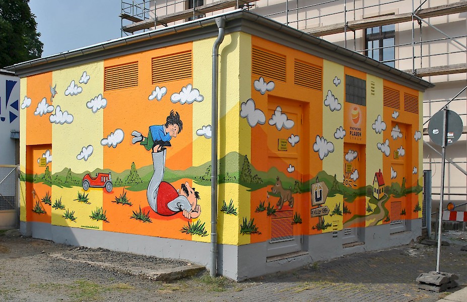Trafostationen mit den berühmten Vater und Sohn Zeichnungen von Erich Ohser setzen Akzente in der Spitzenstadt. Entstanden sind sie im Auftrag der Stadtwerke Strom Plauen.