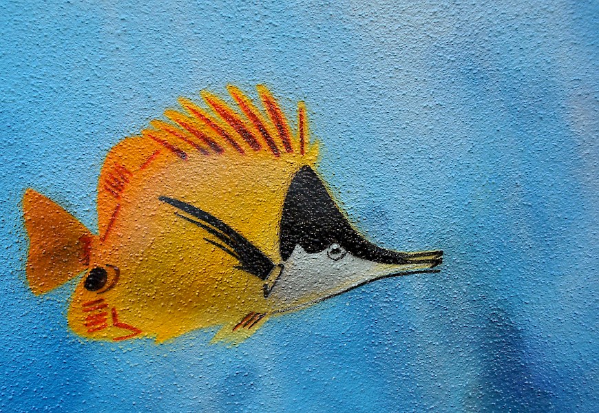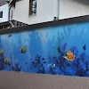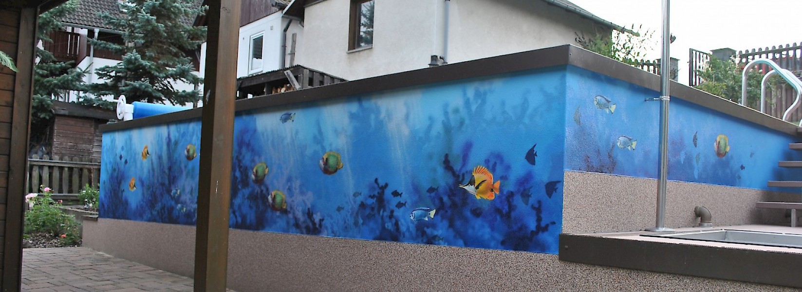 Außengestaltung eines Pools mit Unterwassermotiven.
